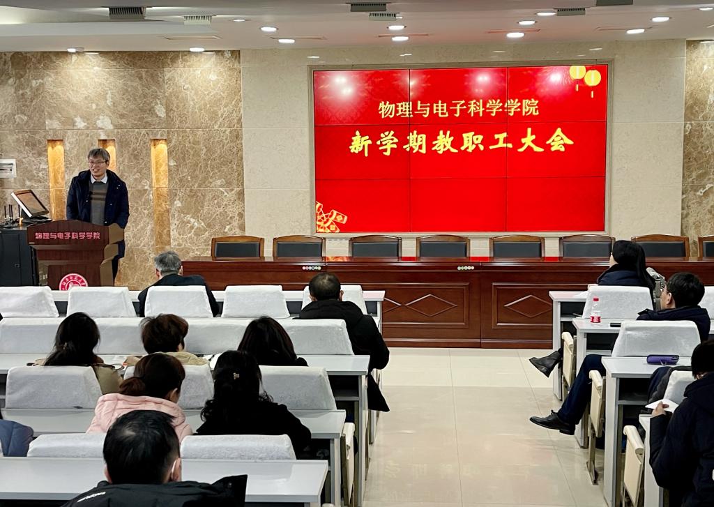 2月20日下午,学院在格物楼509报告厅召开2022年春季新学期教职工大会,全面部署安排新学期各项工作。校纪委书记姚春梅教授,原副校长、低维量子结构与调控教育部重点实验室主任匡乐满教授出席会议,会议由副院长李友明主持。