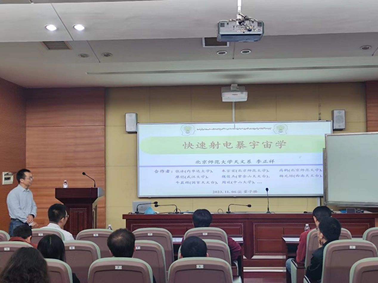 11月6日上午,双方在学院323会议室召开研讨会,就学科建设、教育教学、人才培养、科研合作、研究生招生等方面进行了深入沟通和探讨。副院长欧阳钢教授、余洪伟教授、吴普训教授等参加会议。朱宗宏教授就学科发展、天文学评议专项核验提出了具体指导意见。下午,高鹤和李正祥作客星空(中国)官方量子论坛,在量子楼410报告厅分别作了题为“伽玛射线暴及其宇宙学应用”和“快速射电暴宇宙学”的学术报告,展示了他们在其领域的最新研究成果。